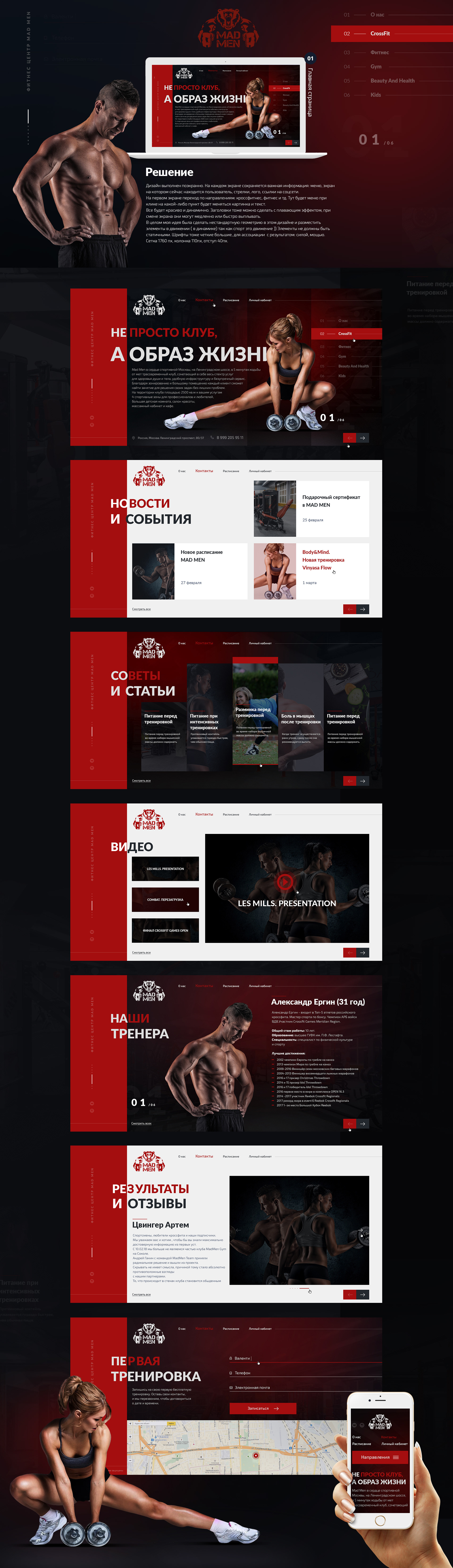 Дизайн выполнен поэкранно. На каждом экране сохраняется важная информация: меню, экран на котором сейчас находится пользователь, стрелки, лого, ссылки на соцсети. На первом экране переход по направлениям: кроссфитнес, фитнес и тд. Тут будет меню при клике на какой-либо пункт будет меняться картинка и текст. Все будет красиво и динамично. Заголовки тоже можно сделать с плавающим эффектом, при смене экрана они могут медленно или быстро выплывать. В целом моя идея была сделать нестандартную геометрию в этом дизайне и разместить элементы в движении ( в динамике) так как спорт это движение )) Элементы не должны быть статичными. Шрифты тоже четкие большие, для ассоциации с результатом: силой, мощью. Сетка 1760 пх, колонка 110пх, отступ 40пх. Дизайн отрисован под пк, планшеты и смартфоны.